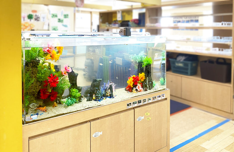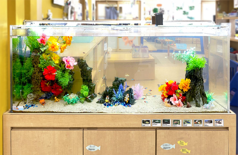 こちらの水槽は施設に通う子供たちに飽きずに楽しんでいただけるよう、季節に合わせてレイアウトを変更しています。
