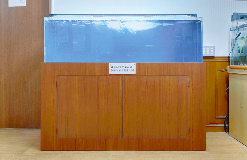 こちらの水槽は、地元の川魚を中心に飼育する予定とのことでしたので、日本淡水魚を飼育できるオーバーフロー式を採用し、水槽台には卒業記念のアルミプレートを取り付けました。