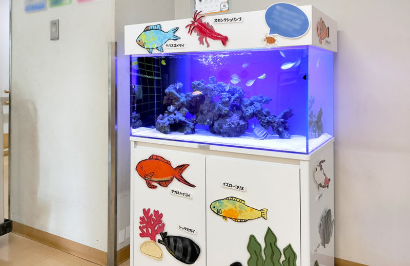 病院内にある子供のための教育施設に設置された、90cm海水魚水槽です。