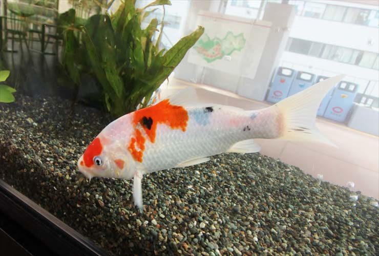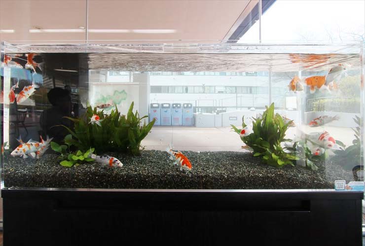 大学構内に設置された、横幅120cmの錦鯉水槽の様子です。