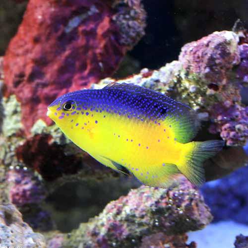 青い体に黄色い尾ひれが特徴のルリスズメダイの近縁種で、シルエットもよく似ていますが、最大体長は5cm程とやや小柄。気性が荒いのは他のスズメダイと変わりませんが、体が小さい分やや大人しめで、幼魚の頃から他の魚と混泳させていれば水槽になじみやすいでしょう。