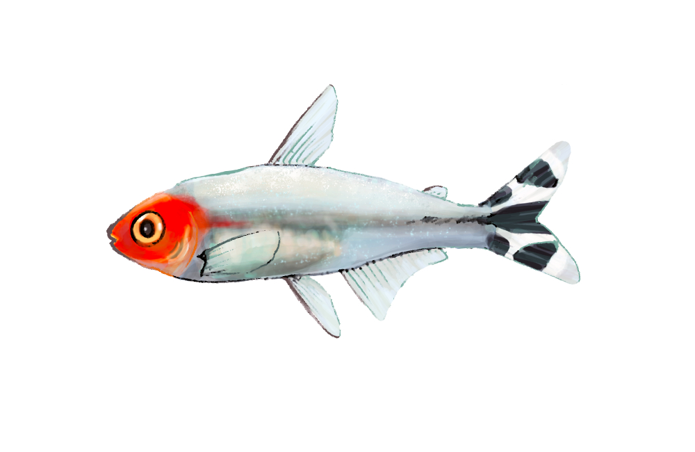 ラミーノーズは小型カラシンの1種で、頭部だけが赤色に染まる独特な体色が特徴です。本種は環境によって発色に変化が見られ、水槽導入時などはストレスを感じて頭部の赤色が薄かったり、小さいこともあります。