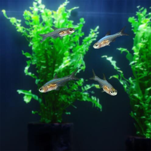 独特の透明感があるグリーンの体色と、オレンジ色の各ヒレが美しく、赤い水草水槽で群泳させたい魚種の1つでしょう。
