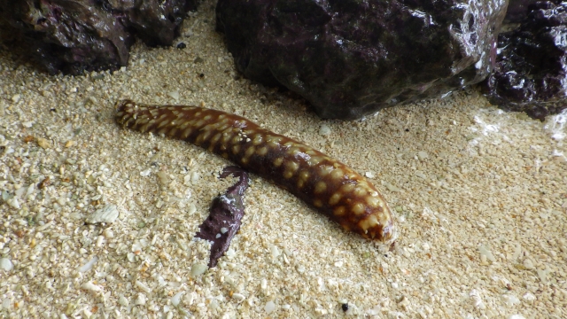 茶褐色の体に白いまだら模様と突起を持つ、鑑賞性の高いナマコです。