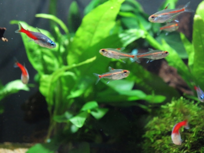 水槽で群れを継続させるには、カージナルテトラよりも大型の魚を混泳させた上で、レイアウトに遊泳できるだけの余裕を持たせるのがポイントです。