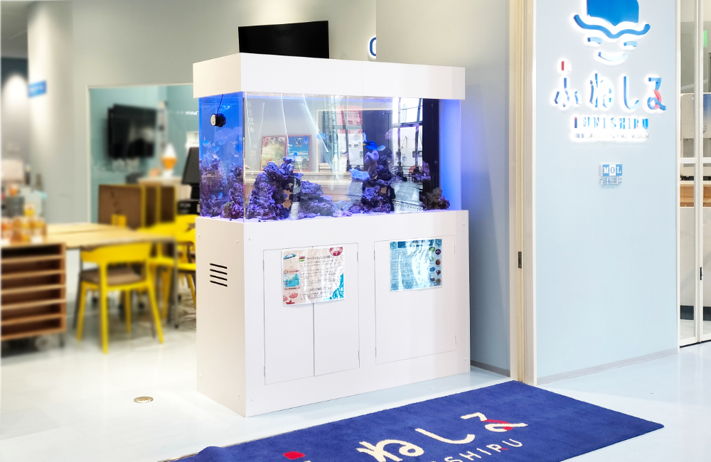 『チョウチョウウオ』の仲間や『ナンヨウハギ』、そして生きた『サンゴ(ソフトコーラル)』たちが導入され、ふねしる様に訪れる、さまざまな年齢層の来場者様に楽しんでいただけるアクアリウムに仕上がっています。