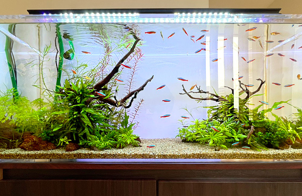 水草のゆらめきに癒される水草水槽は、自然の川や湖を感じられ、視覚的にリラックス効果を提供できます。