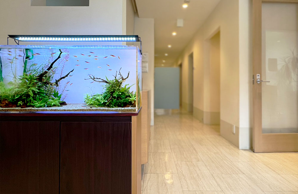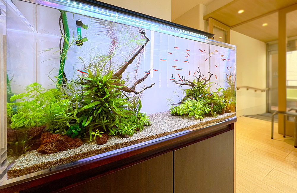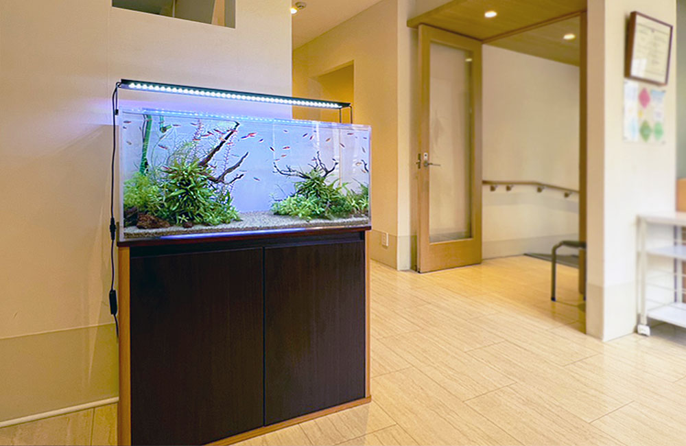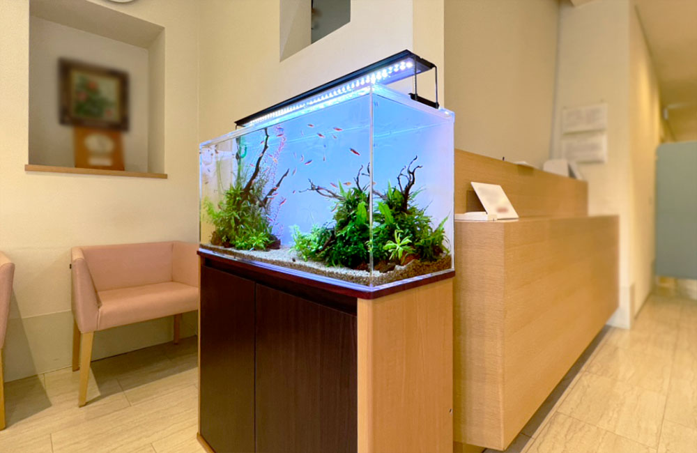 緑の自然を感じられる癒しの水草水槽で、待合スペースで過ごす患者様に心地よいリラックス空間を提供しています。