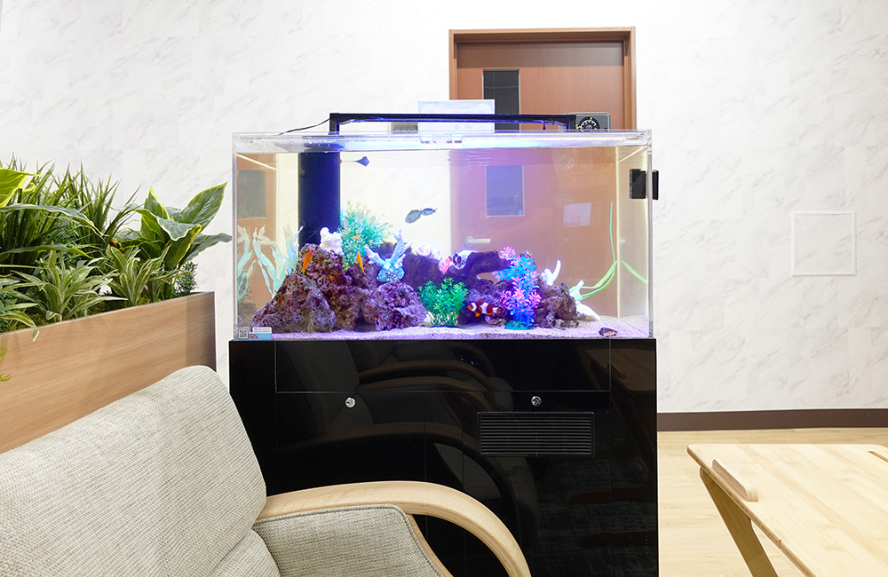色鮮やかな海水魚が泳ぐアクアリウムが、オフィスに彩りと安らぎをもたらします。