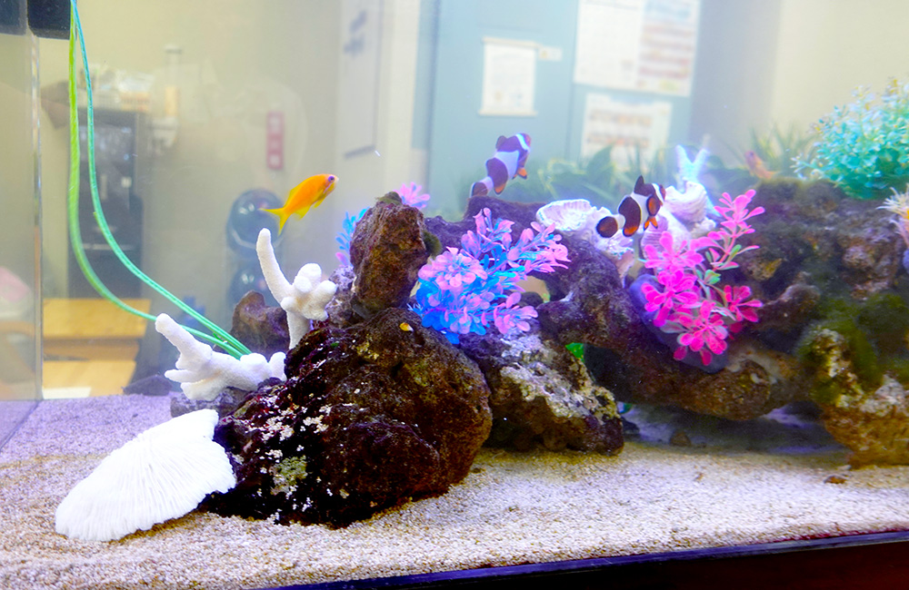 当初はロッカールームに設置されていましたが、現在はオフィスのミーティングスペースに水槽を移動しています。