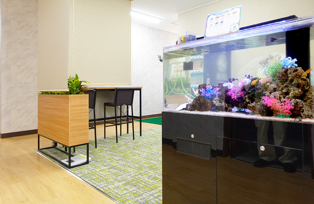 癒しの空間を演出するアイテムとしてだけでなく、ミーティングスペースのインテリアとしても活躍しています。水槽のそばには観葉植物も飾られており、アクアリウムの水の輝きと観葉植物の緑が調和し、よりリフレッシュできるでしょう。