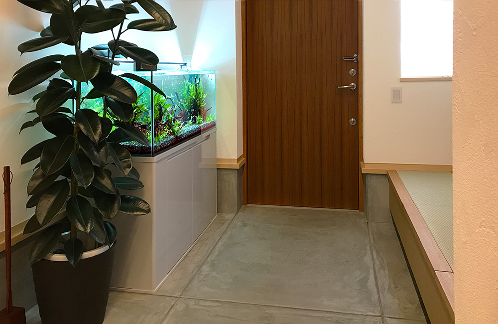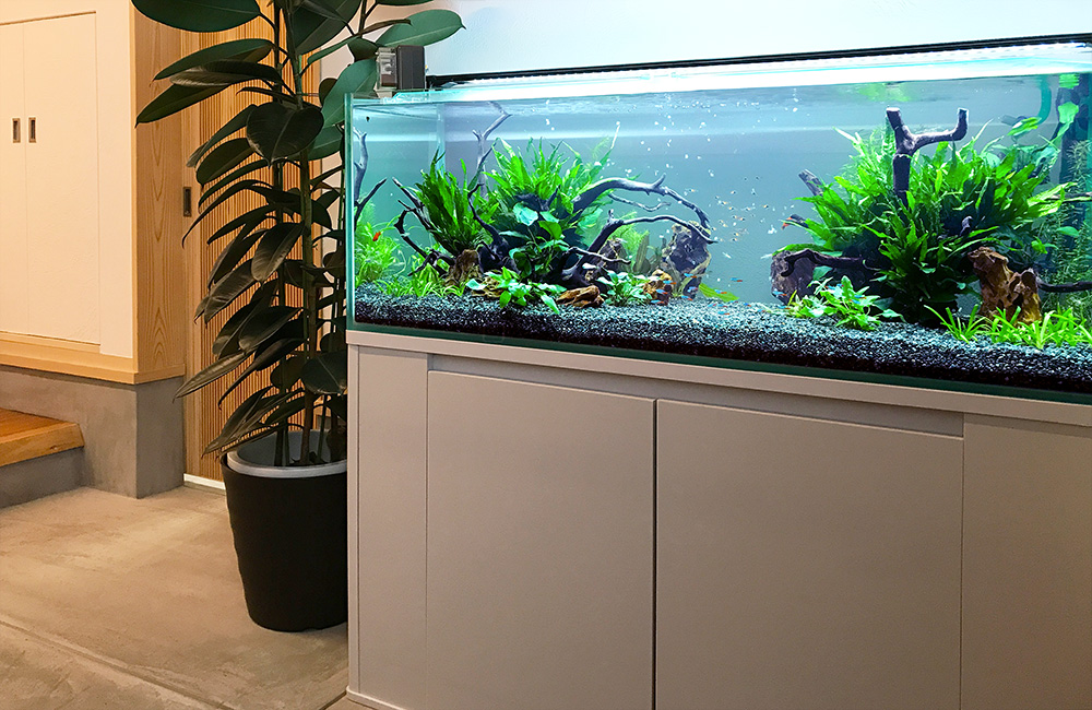 アクアリウム水槽は、「生き物を飼育している」という特殊性から注目度はもちろん、空間演出力が高いインテリアです。和モダンなモデルルームの特別感を引き出しています。