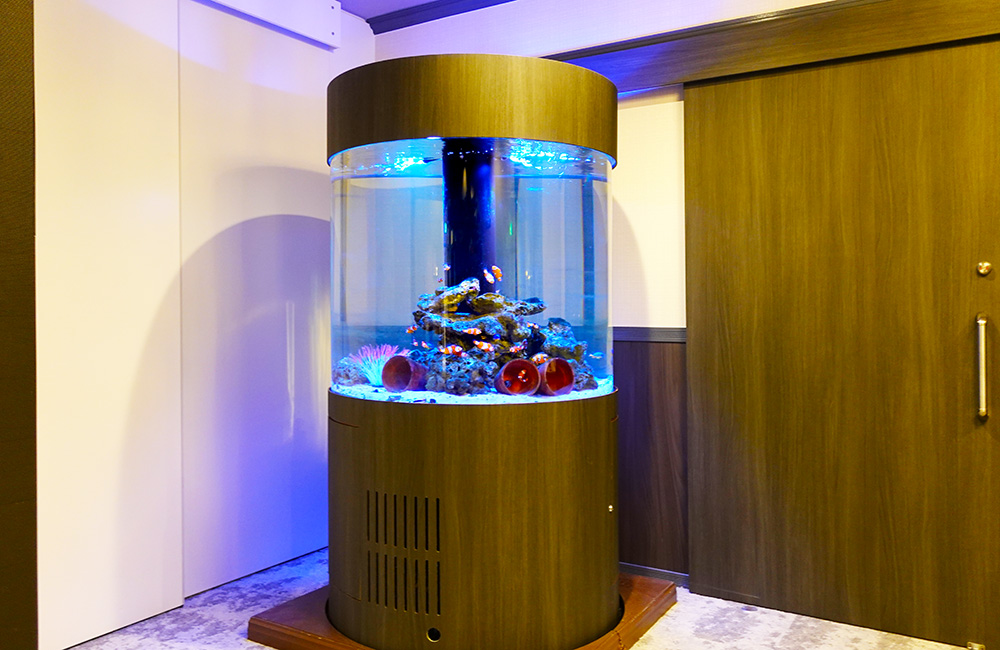 今回は、直径1mの大型円柱水槽を制作しており、設置場所のインテリアに調和する洗練されたアクアリウムに仕上がりました。特注水槽で楽しむアクアリウムは、より一段と愛着が湧いてくるでしょう。