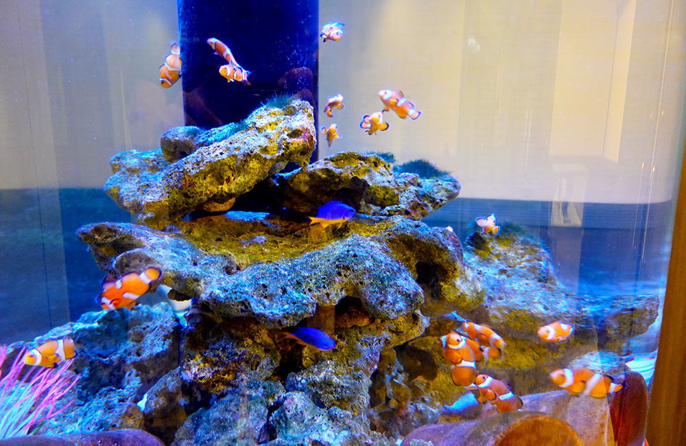 また、青い照明の効果もあり、透明感のある海のイメージを演出するアクアリウムです。