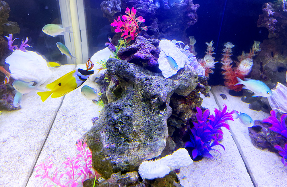 カクレクマノミをはじめ、『デバスズメダイ』や『イエローコリス』など、さまざまな種類の海水魚たちがアーチの間を泳ぐなど、ちょっとした見どころに仕上がりました。