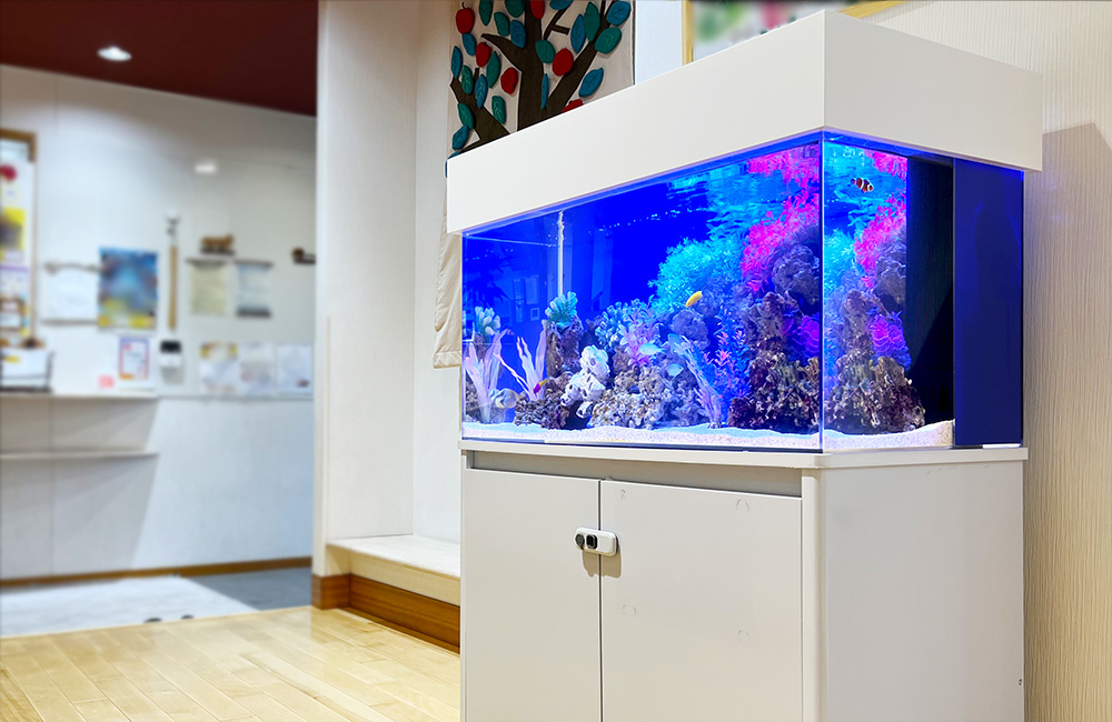 海水魚水槽は保育園のエントランスに設置されており、月2回の定期メンテナンスで管理しています。