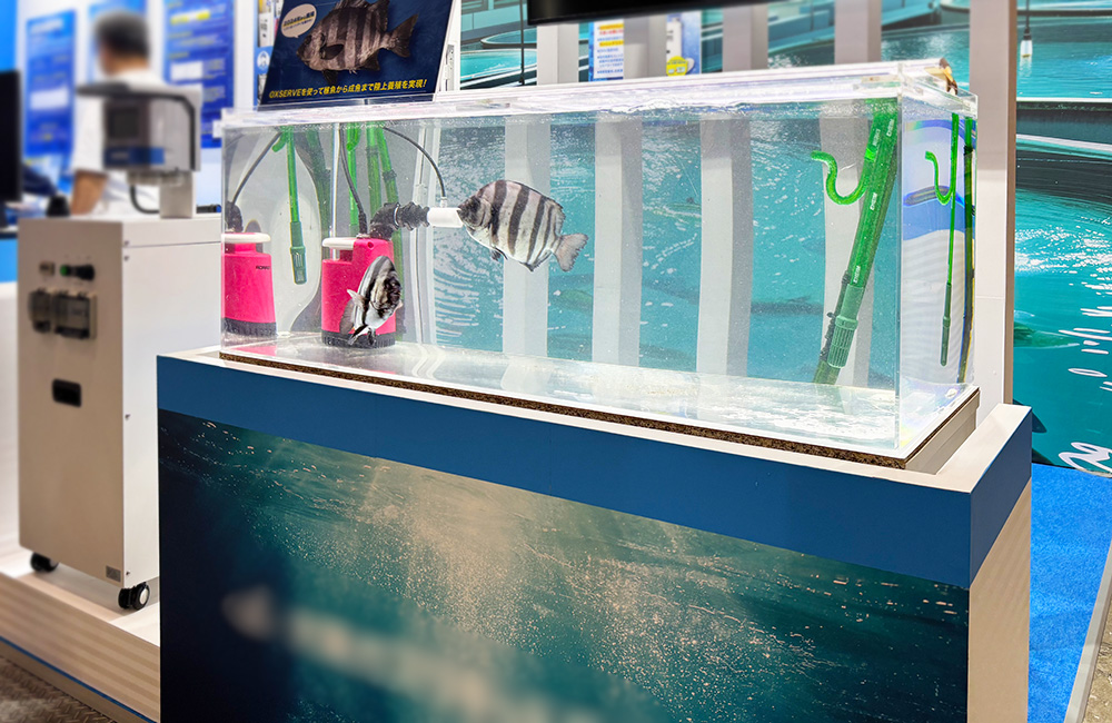 展示されている『曝気装置』は、養殖魚の成長を促すもので、大きく、健康で、肉付きの良い魚体に仕上げるためのアイテムです。また、水中の溶存酸素を増加させることで魚たちの活性を高めます。