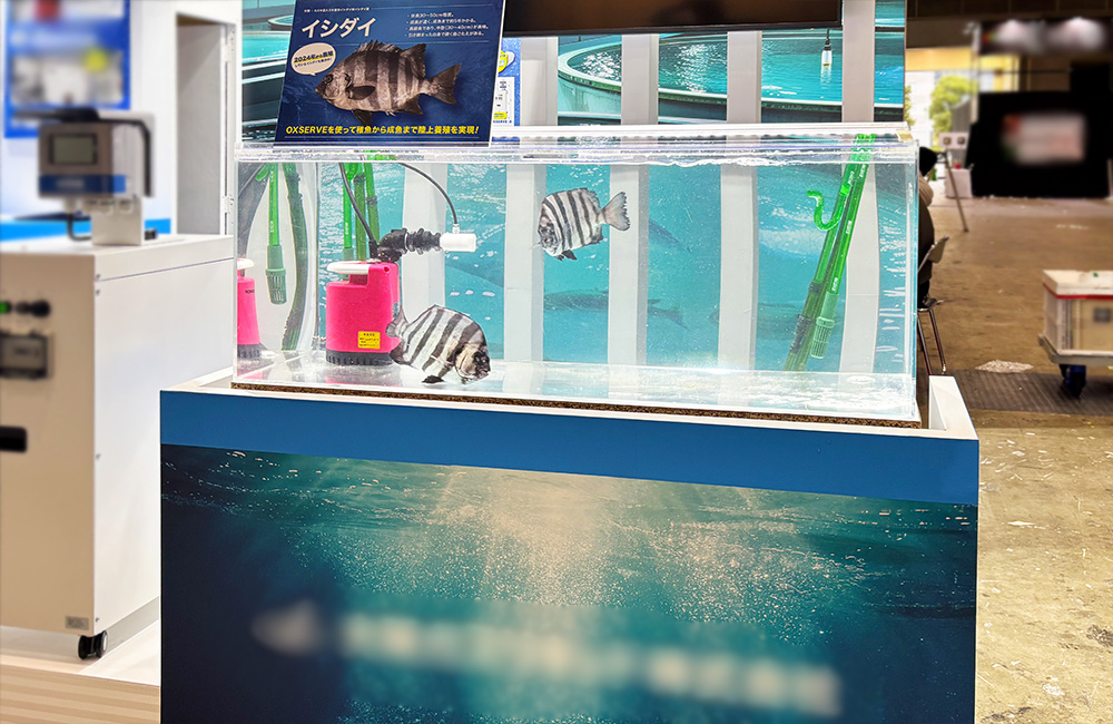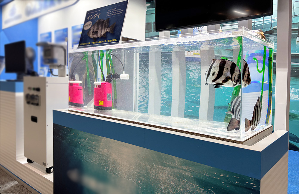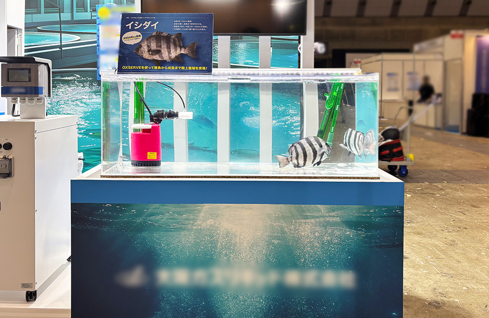 東京都江東区の開催されたシーフードショーにて、企業様に養殖魚の『イシダイ』と、養殖用の曝気装置を展示するいけす水槽の短期レンタルをご利用いただきました。