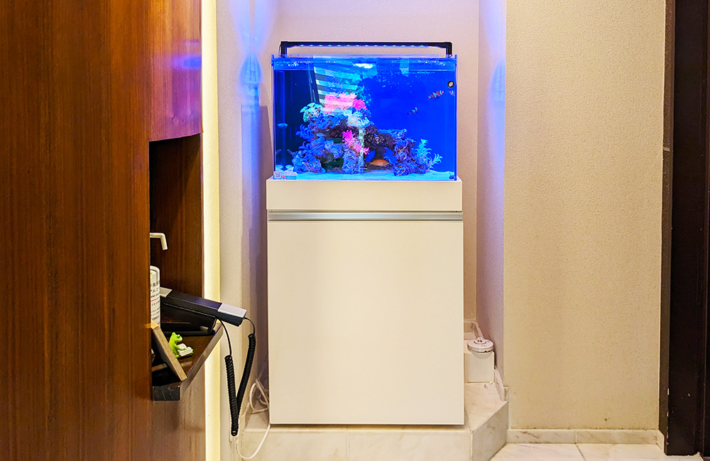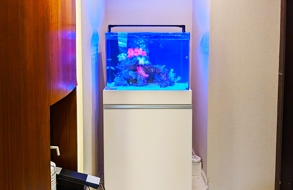 設置当初は45cmの海水魚水槽でしたが、2023年に経年劣化のため水槽を交換しており、現在の横幅60cm×奥行き・高さ45cmの水槽にサイズアップしました。
