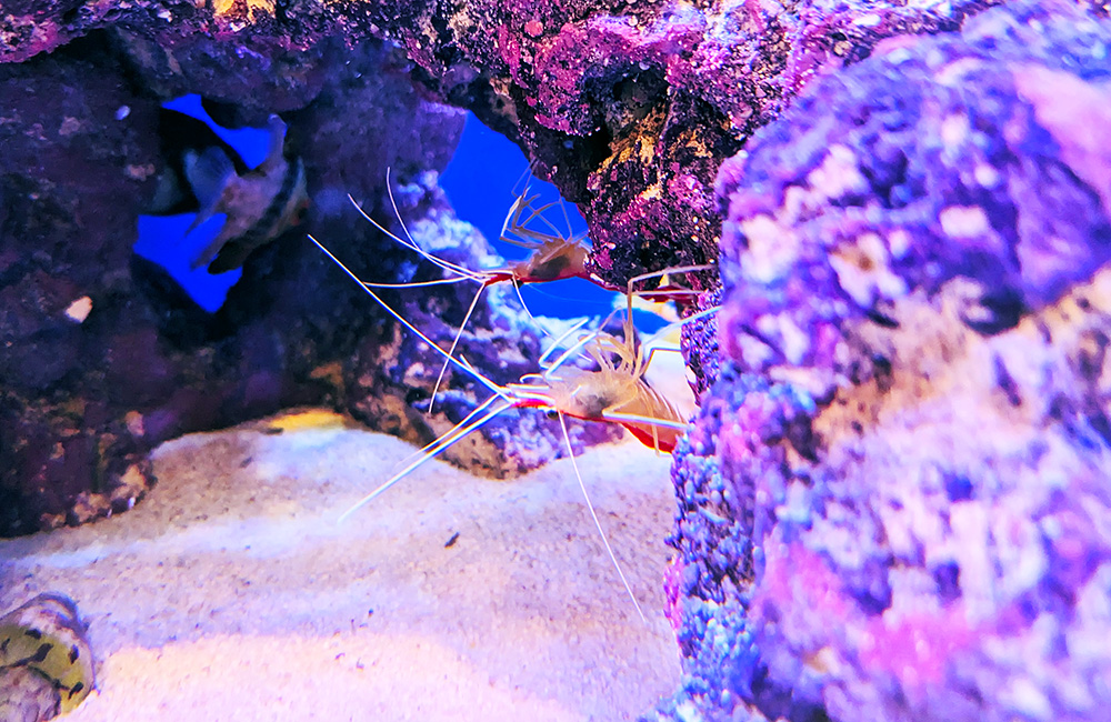 スカンクシュリンプは、海水エビの中では少し気が強い種類です。遊泳スペース・隠れ家が少ない中型以下の水槽では、小競り合いを起こすことがあります。