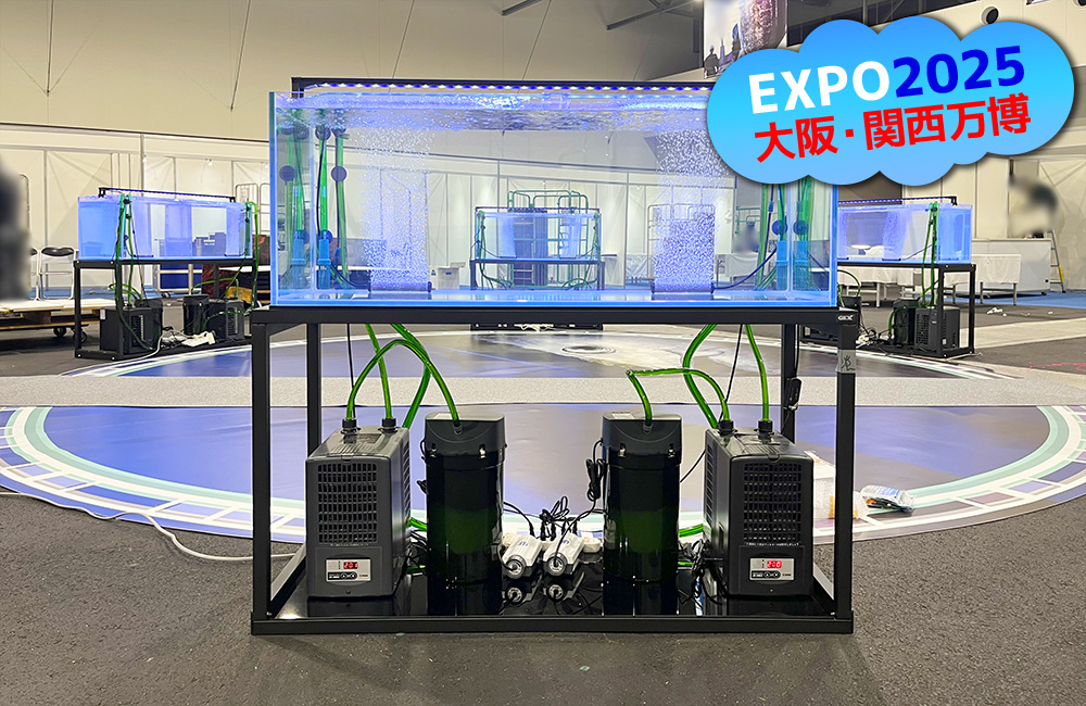 そして、活魚に適した低水温を維持するために『水槽用クーラー』も1つの水槽に対して2台接続しています。万博の開催時期はまだ気温が高く、強力な冷却は欠かせません。そのため今回の展示では外部フィルター1台につき1台ずつ接続し、合計12台の水槽用クーラーをご用意しました。