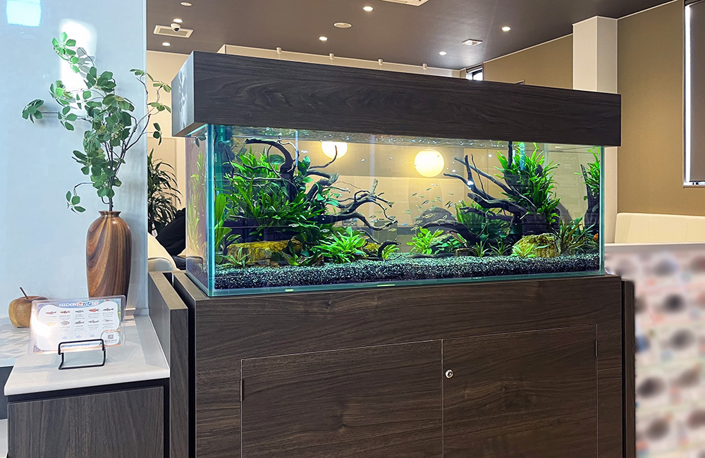 木目調で統一された内装にあわせた、おしゃれな水槽台やキャノピー(天蓋)を採用。水槽内部の流木レイアウトも周囲と統一感があります。
