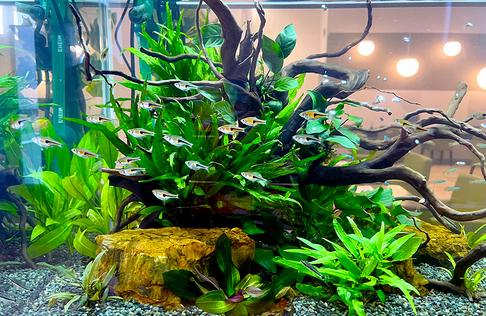 水草と流木がレイアウトされた水槽は、ほどよいパーテーションにもなります。