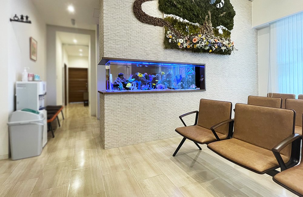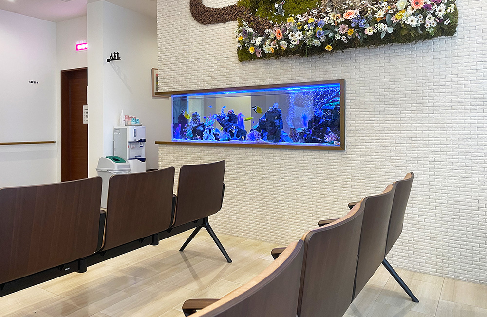 待合スペースに設置された横幅2.2mの大型水槽は、月2回の定期メンテナンスで管理しており、患者様に美しいアクアリウムを常に楽しんでいただいております。