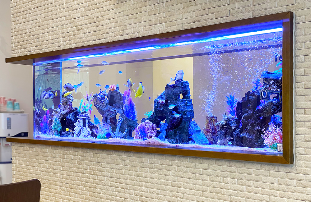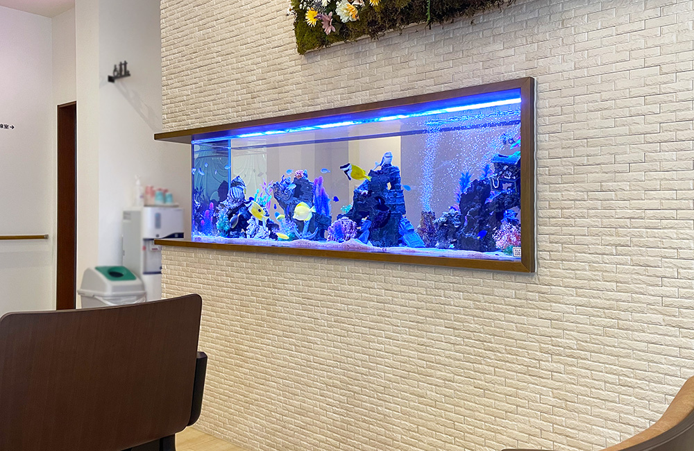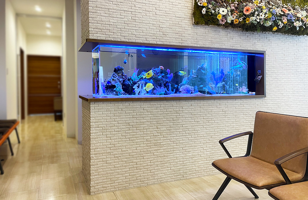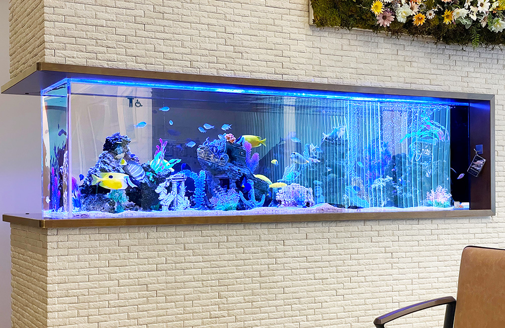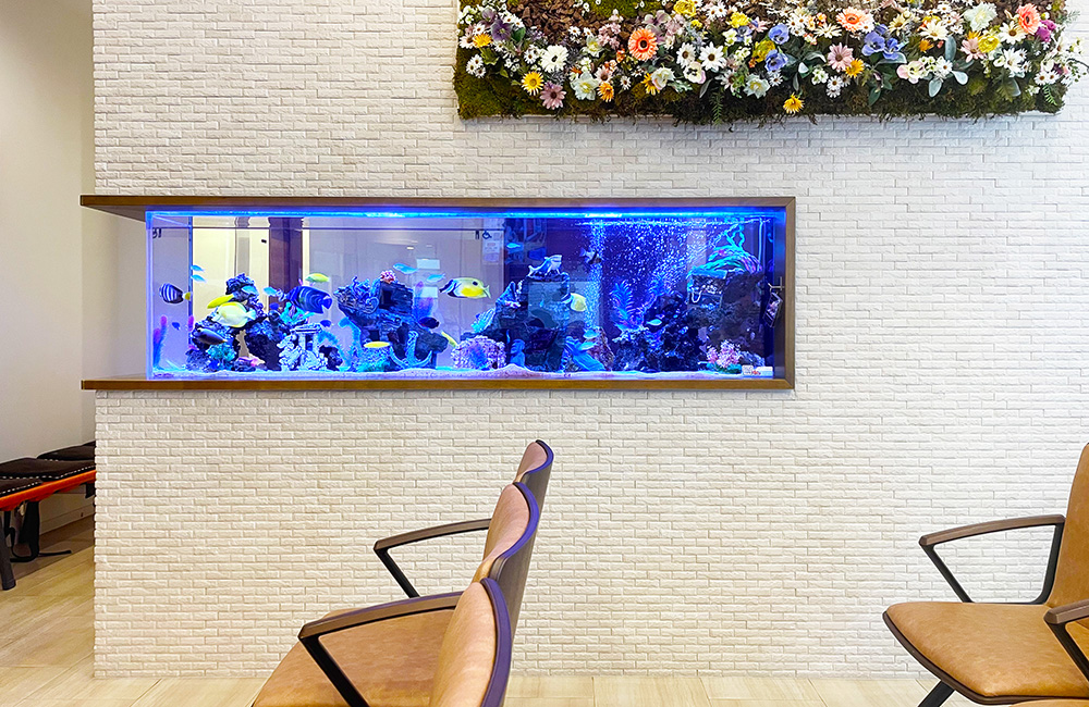 埋め込み式水槽は、クリニックや店舗のエントランスに取り入れると、ブランドイメージを格段にアップグレードでき、特別感のあるインテリアとしてもおすすめです。