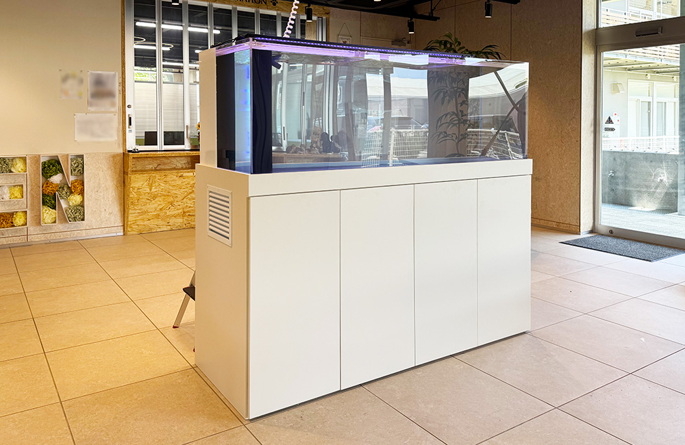 また、水槽本体はもちろん、水槽台やろ過槽に至るまで、すべて設置場所の環境に合わせて設計されています。オーダーメイド水槽ならではの、空間と用途にフィットした大型水槽です。