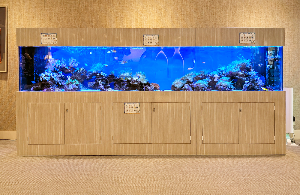 こちらの水槽台や天蓋(キャノピー)は、ホテルの内装に合わせて明るい木目調の化粧板仕上げで、ホテルのラグジュアリーな雰囲気になじんでいます。