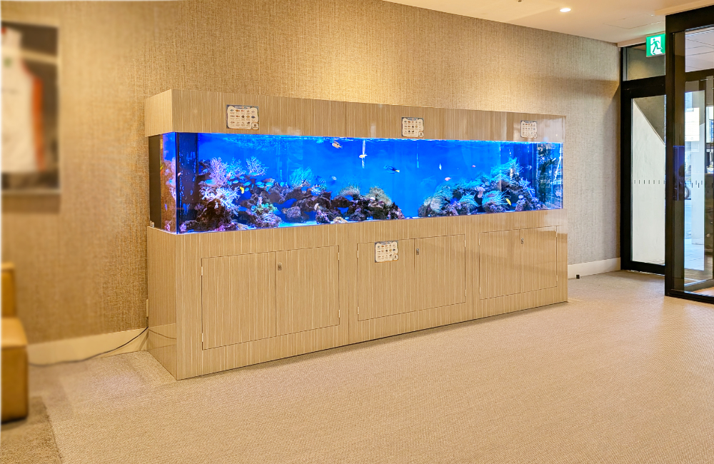千葉県船橋市のホテルフローラ船橋様には、3.5mの超大型サンゴ水槽を設置し、2023から水槽メンテナンスサービスで管理・維持しています。