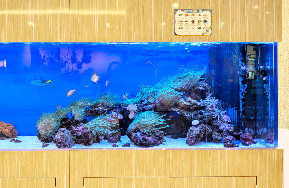 まるで本物の海を切り取ったかのような水景を楽しめるサンゴ水槽になっており、ゆらゆらと揺れるイソギンチャクやサンゴが幻想的な空間を演出しています。