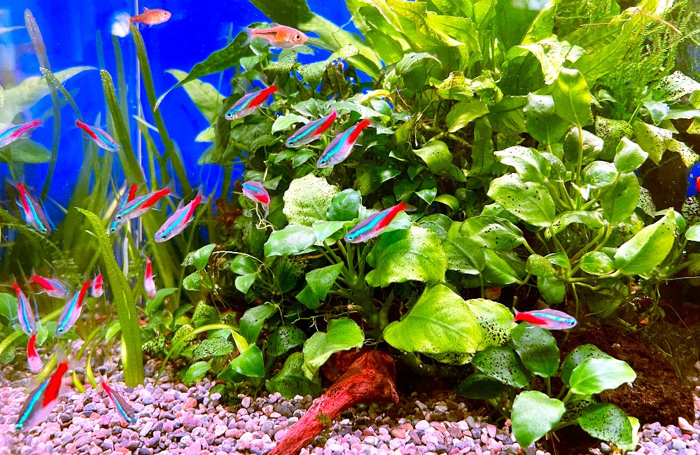 水槽正面だけでなく、横から観賞しても水草の豊富さを感じられ、ブルーとレッドの光沢が美しい『ネオンテトラ』などの小型熱帯魚がよく映えるアクアリウムです。