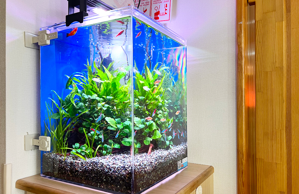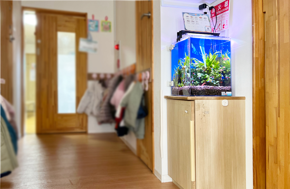 比較的重量の軽い小型水槽でもあるため、保育園の備え付けのキャビネットの上で運用できており、省スペースで楽しめる水槽です。