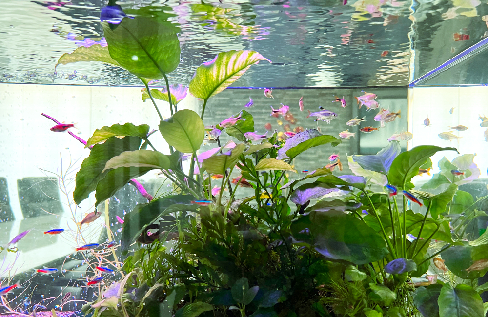 水槽には、熱帯魚の中でもポピュラーな『カージナルテトラ』や『シルバーチップテトラ』、『グローライトテトラ』などの小型魚を中心に導入しています。