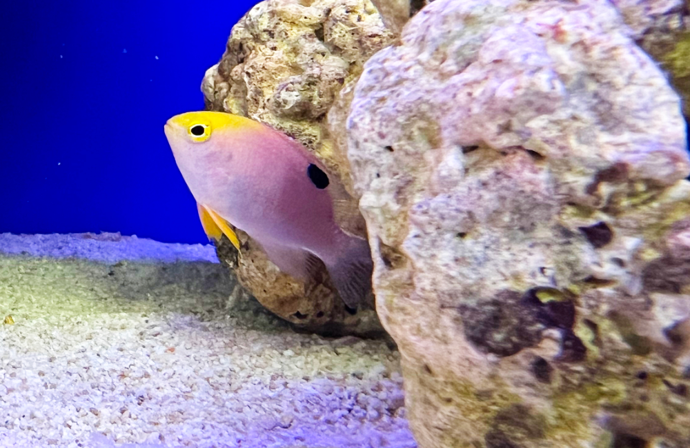 写真の『トールボッツダムセル』というイエロー・ピンク〜淡いパープルの体色が特徴的な可愛らしい魚種です。他のスズメダイの仲間たちと混泳させれば、その可愛らしいカラーでポイント生体としても注目されます。性格も比較的穏やかで混泳させやすい海水魚です。