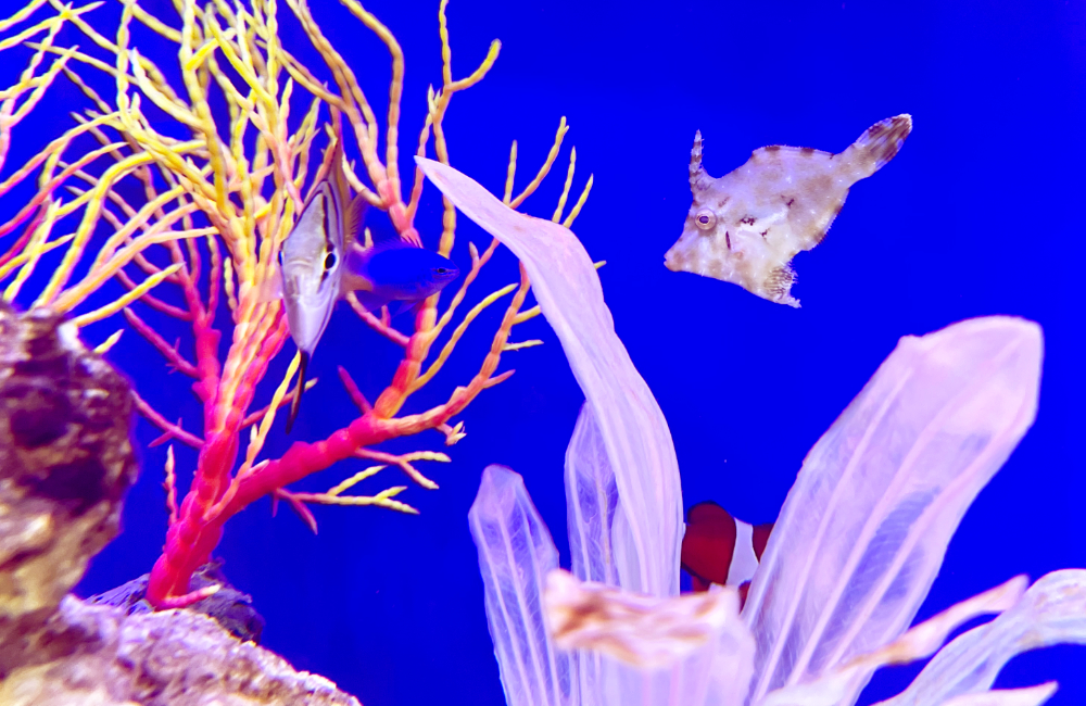 海水魚にはユニークな見た目の魚種が多く、こちらの水槽にも頭に突起を持つ『フチドリカワハギ』など個性的な見た目をした魚がおり、観賞していて楽しいアクアリウムです。
