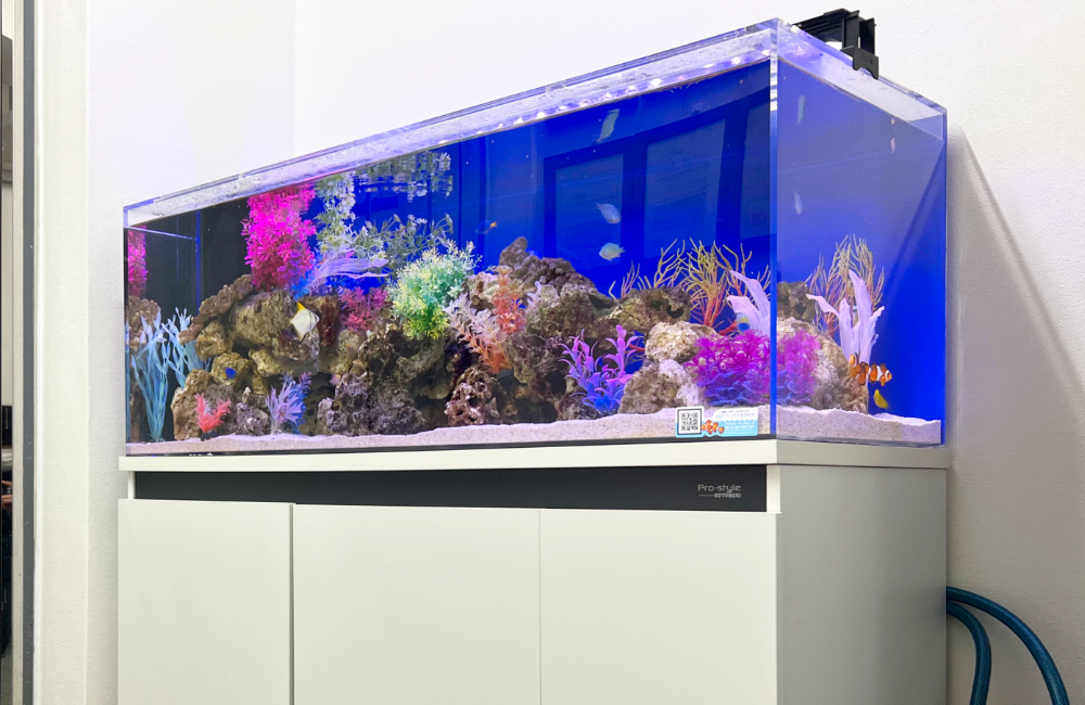 東京都台東区の企業様は、設置当初は60cm海水魚水槽でしたが、海水魚水槽を大変気に入ってくださり、2024年に90cm海水魚水槽にサイズアップしました。
