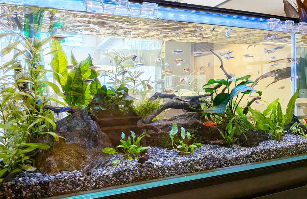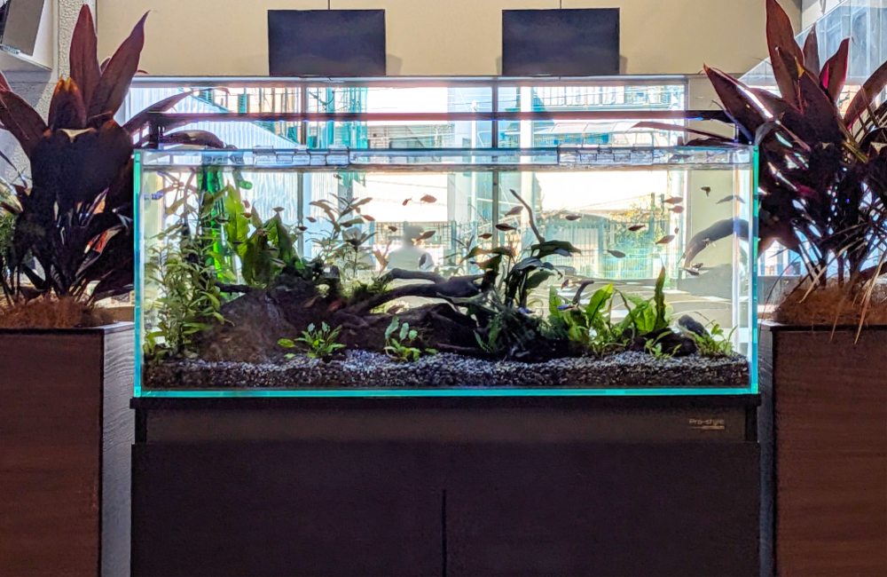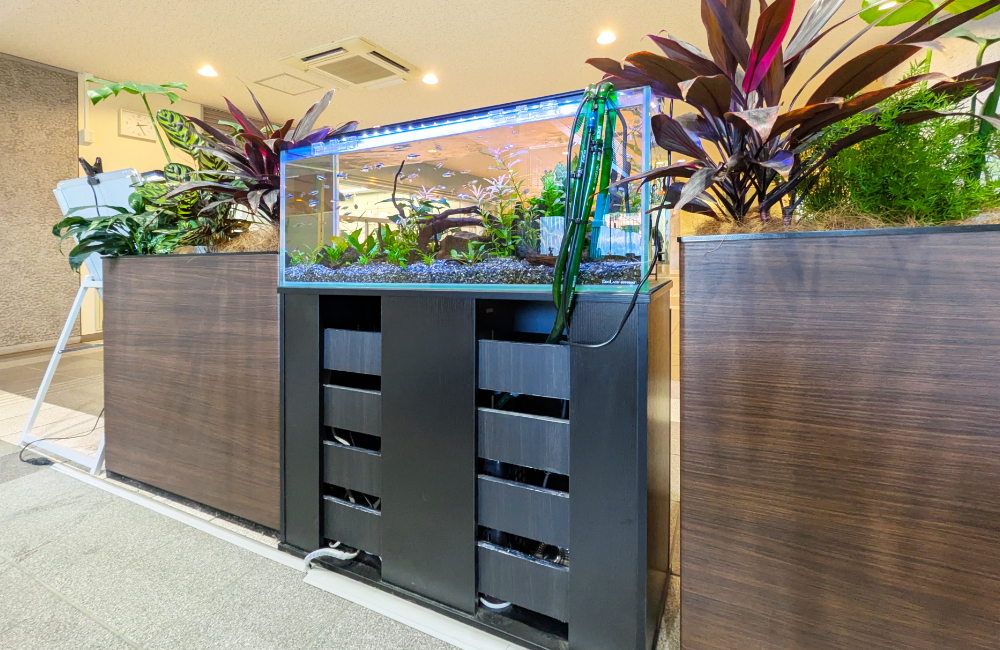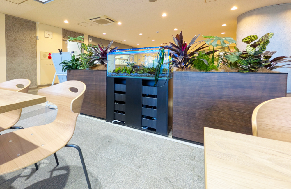 カフェスペースに設置された水槽を月4回のお掃除・水換えなどのメンテナンスで美しく維持。